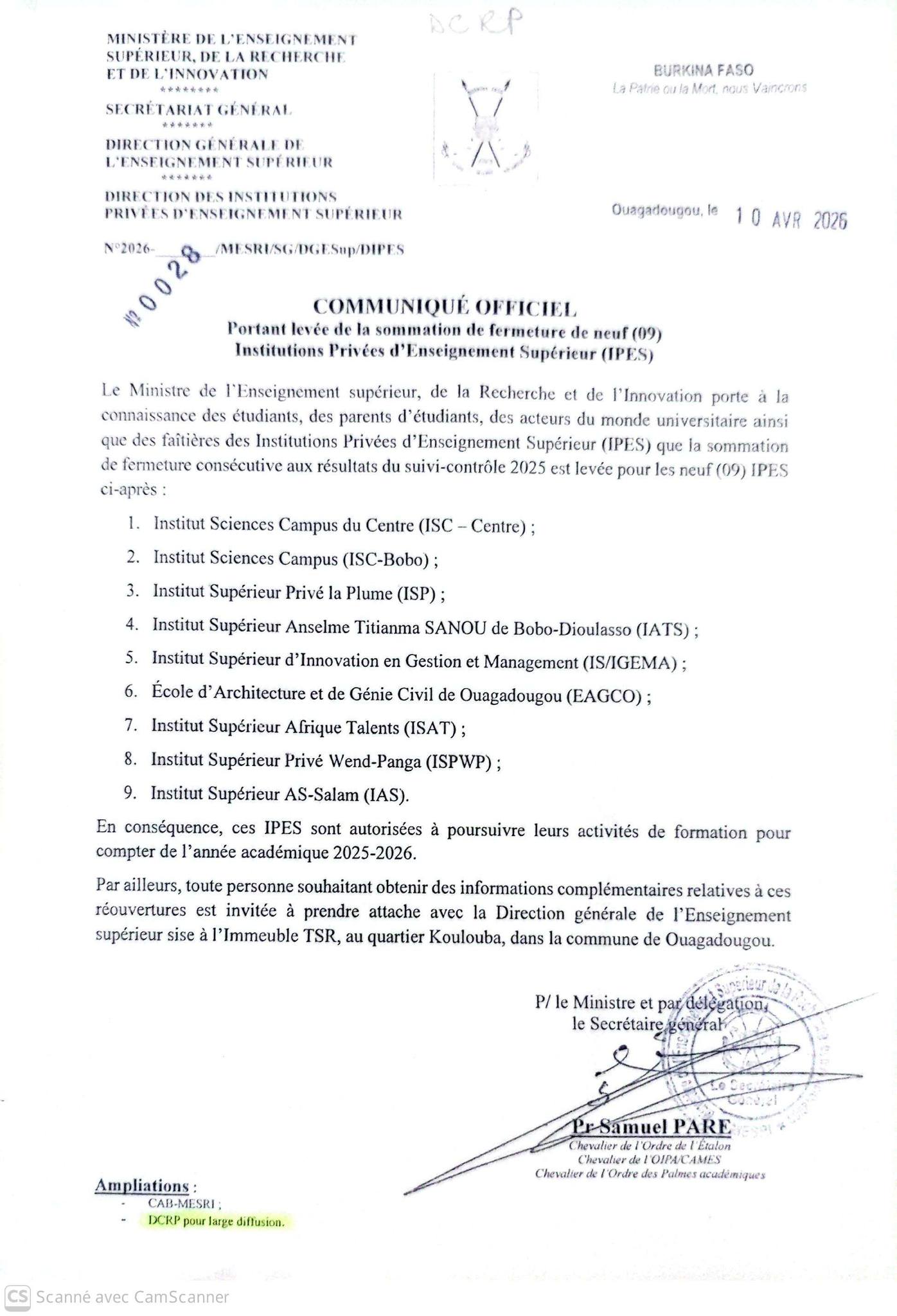 Le Directeur général de l’Enseignement supérieur porte à la connaissance du…