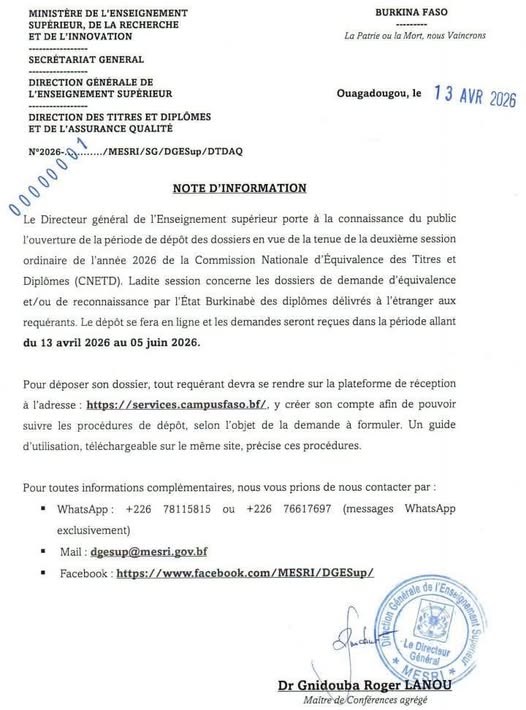 Le Directeur général de l’Enseignement supérieur porte à la connaissance du…